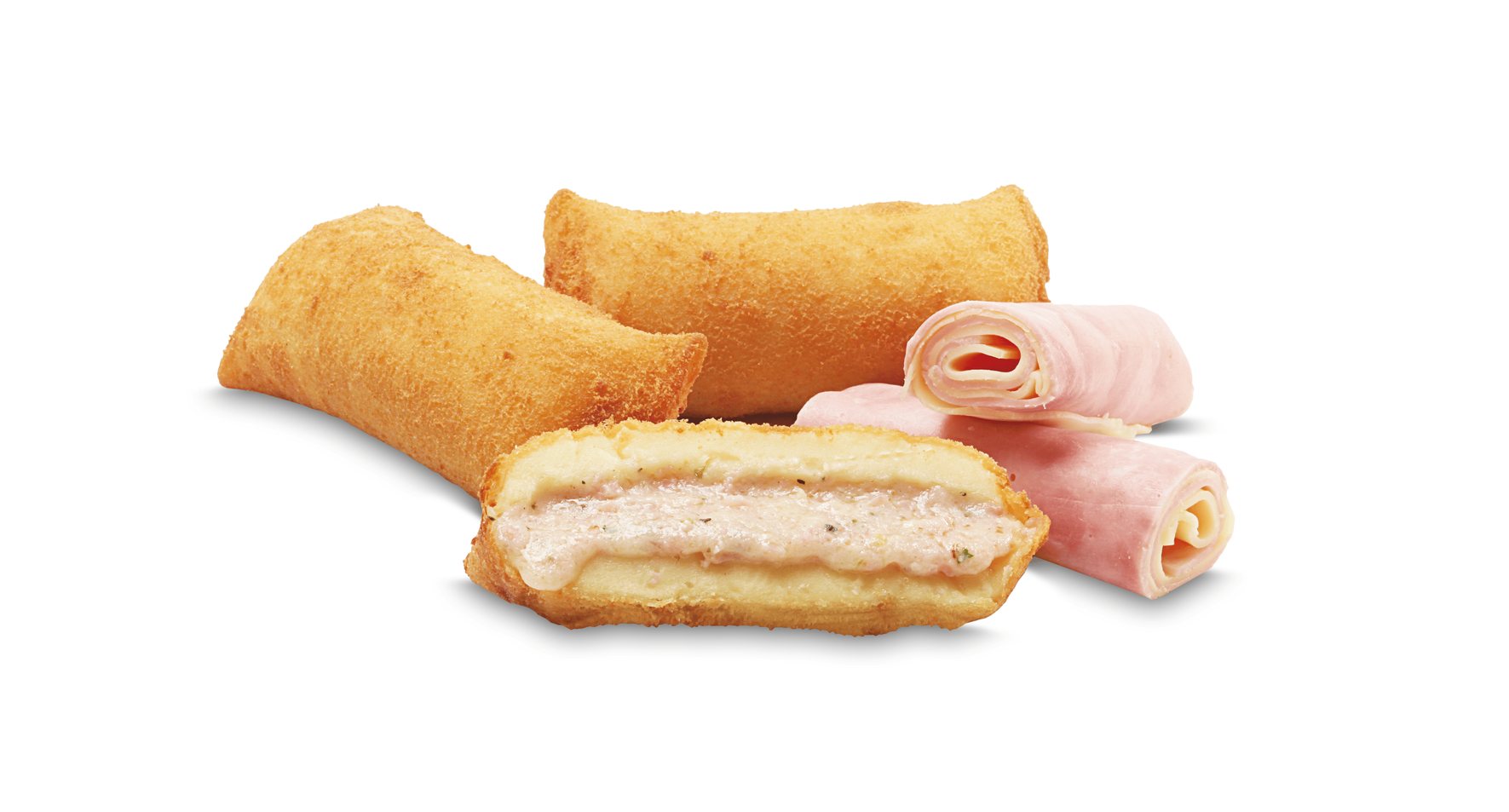 Água, farinha de trigo enriquecida com ferro e ácido fólico, queijo, presunto, batata em flocos, margarina, farinha de rosca, mistura de requeijão (requeijão, gordura vegetal e amido), composto lácteo, condimento preparado sabor galinha, sal refinado hipossódico, amido de milho, óleo de soja5, especiarias e ligante para empanamento.
