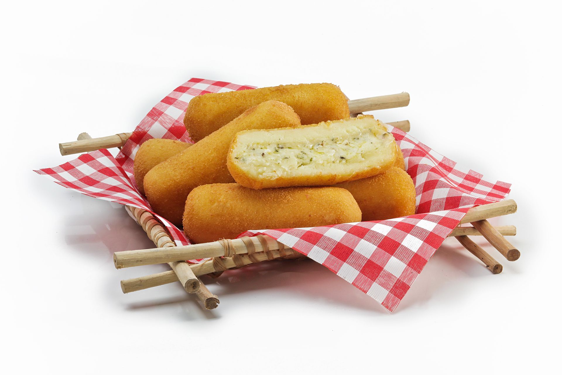 Água, farinha de trigo enriquecida com ferro e ácido fólico, queijo, batata em flocos, mistura de requeijão (requeijão, gordura vegetal e amido), margarina, farinha de rosca, composto lácteo, condimento preparado sabor galinha, óleo de soja, sal refinado hipossódico, amido de milho, especiarias e ligante para empanamento.