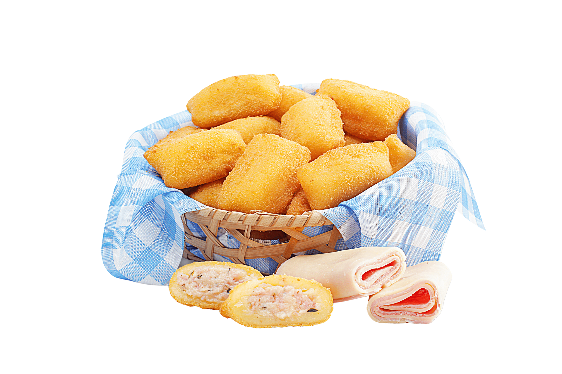 Água, farinha de trigo enriquecida com ferro e ácido fólico, queijo, presunto, farinha de rosca, batata em flocos, margarina, mistura de requeijão (requeijão, gordura vegetal e amido), composto lácteo, condimento preparado sabor galinha, sal refinado hipossódico, amido de milho, óleo de soja, especiarias e ligante para empanamento.